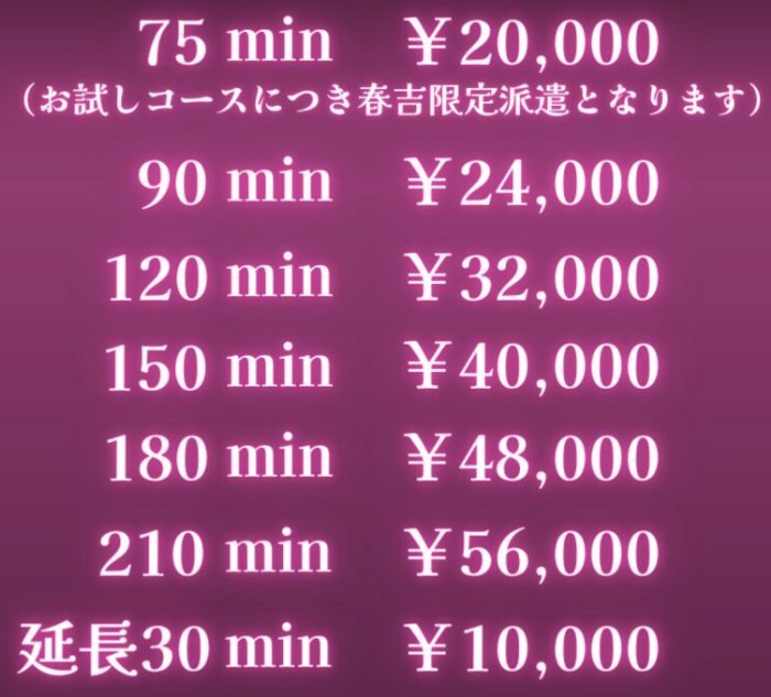 料金は春吉エリア限定のお試し75分20,000円があり、他のエリアだと90分24,000円から利用できます。
