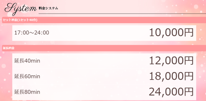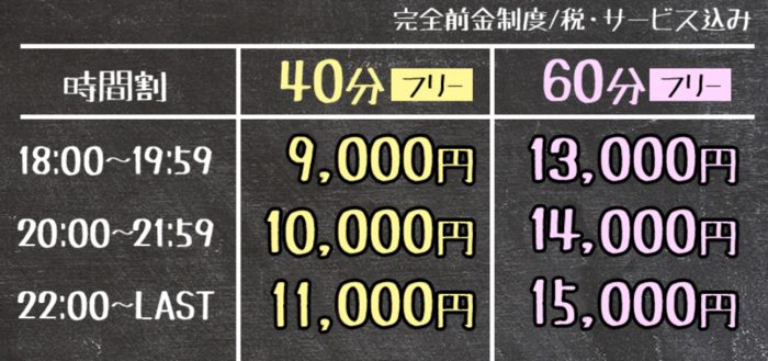 | 20:00〜ラスト | 10,000円 | 14,000円 | 18,000円 |