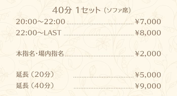料金は40分7,000円からで、広々としたソファ席で快適に過ごせます。