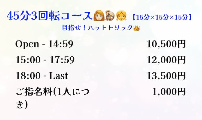 45分3回転のコースは3人の女の子と遊べるので、気になる子がたくさんいる人におすすめです。
