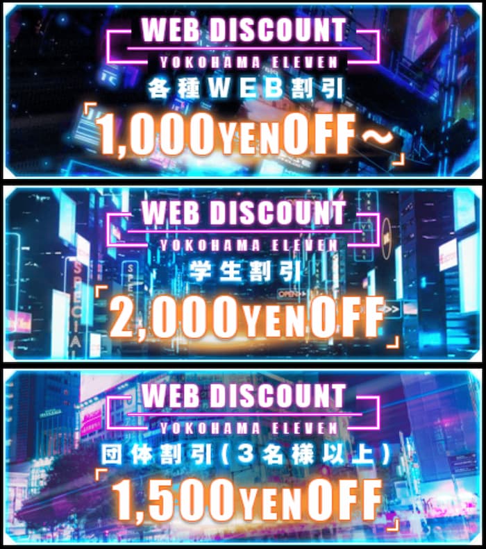 - 横浜割引:横浜市在住は身分証明証提示で1,500円オフ(18時以降/本指名・TEL予約利用不可)