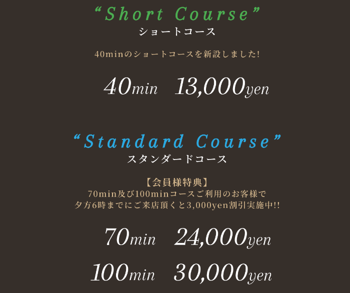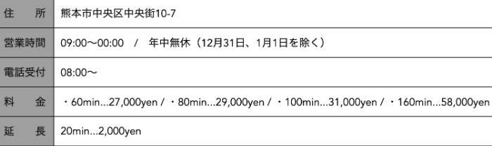| 基本料金(総額) | 50分 11,000円~ (会員価格) |