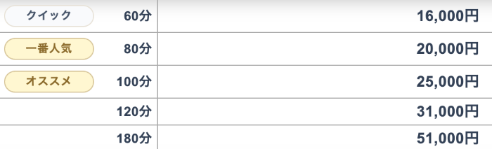 | 基本料金 | 60分 12,000円~ ※エステコース |