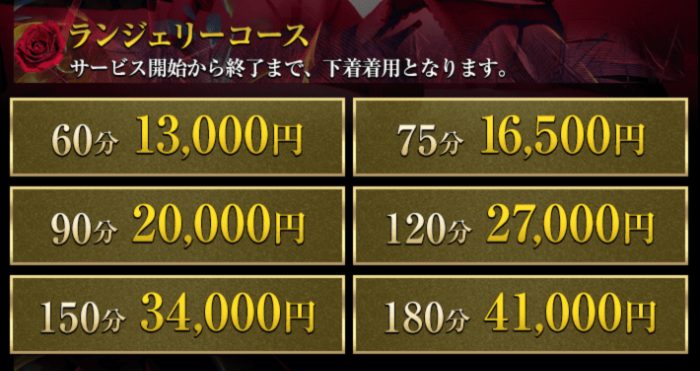 料金は衣装によって異なり、ランジェリー着用コースの60分13,000円から用意されています。