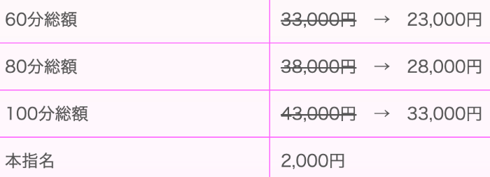 | 基本料金(総額) | 70分 25,000円〜 ※入浴料無料イベント |